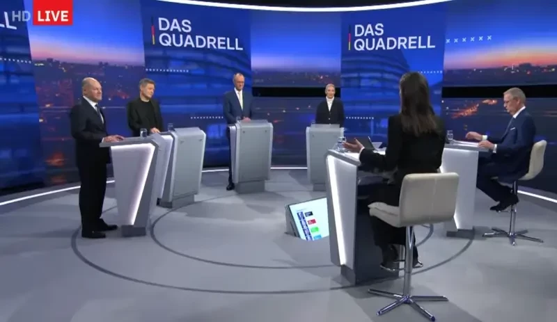 И вот, в преддверии этого (теперь без шуток), очень значимого для Германии события, 16 февраля состоялись телевизионные дебаты между представителями четырёх ведущих партий, они же, кандидаты на пост канцлера. Дебатировали Олаф Шольц от SPD, Фридрих Мерц от CDU, Роберт Хабек от Grüne и Алис Вайдель от AfD.