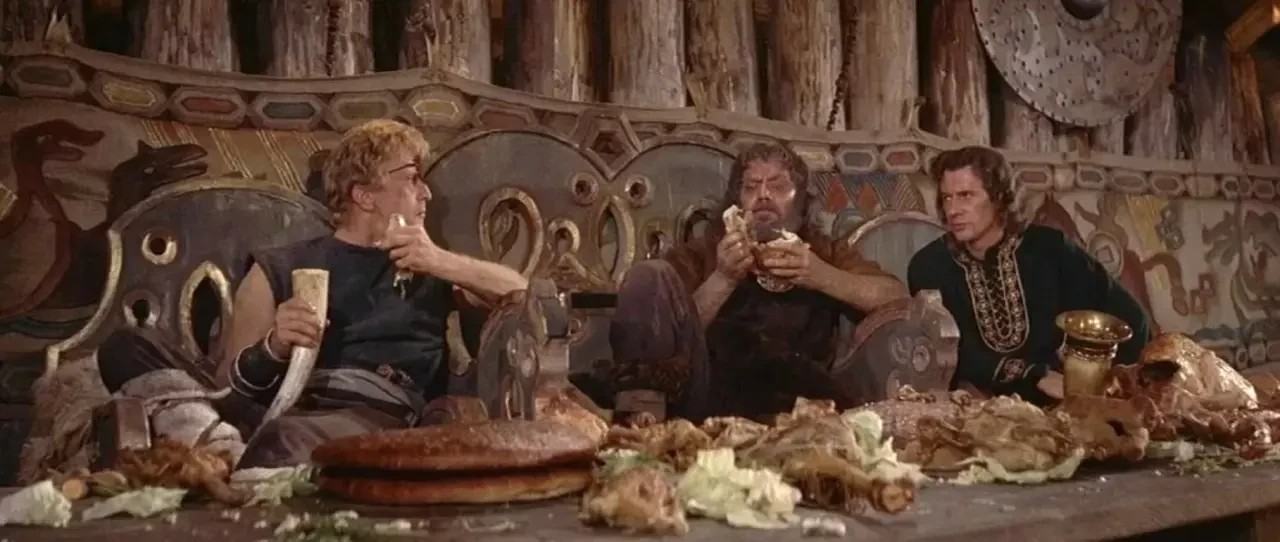 В фильмах изображается пир викингов, как безумная вакханалия. Фильм «Корабли викингов». 1963.