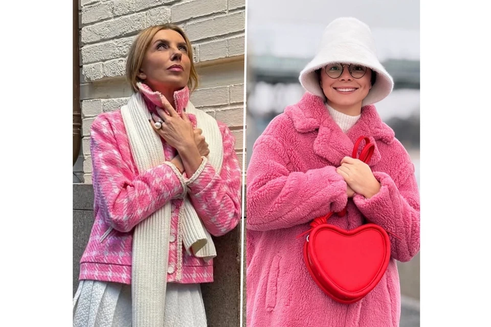 Звезды в розовом: Бондарчук — в твидовом жакете в оттенке Barbie, Брухунова — в яркой шубе