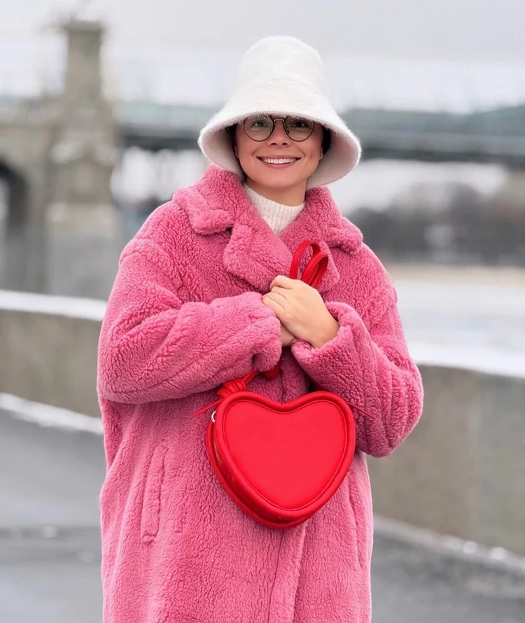 Молодая жена Петросяна выгуляла ярко-розовую шубу из экомеха. Ее она скомбинировала с белым трикотажным платьем и алой сумкой в виде сердца. Можно ли сочетать два ярких оттенка в одном образе? Да. Тем более, розовый и красный — аналогичные цвета. Правда, в таком случае остальные элементы в луке должны быть нейтральными — белыми, черными или серыми. Татьяна дополнила образ белой меховой панамкой, которую я бы заменила просто на шапку.